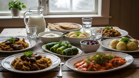 A traditional Scandinavian dinner spread featuring cabbage rolls (kaldolmar), mashed potatoes, and lingonberry jam. The table also includes cured salmon, meat stew, and crispbread, set near a window overlooking a wintery landscape.