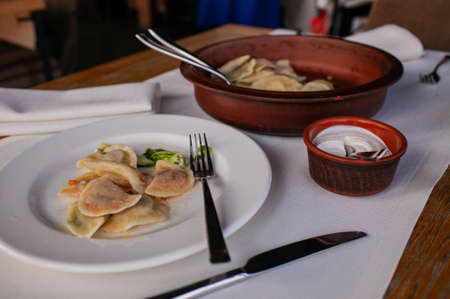 fresh boiled meat dumplings served with dill in a restaurant.