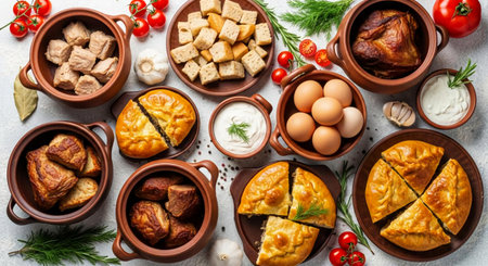Traditional georgian cuisine. Assorted pies, meat, cheese, meat, vegetables, eggs on white background. Top view.