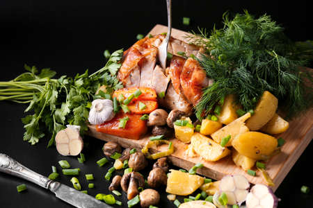 Baked bird with mushrooms and potatoes on a dark background. Appetizing grilled duck with vegetables on a black background