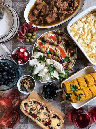 homemade lunch with salads, meat and corn, various types of sauces and pink wine