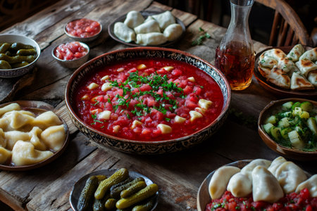 Rustic table set with borscht, dumplings, pickles, and bread, showcasing a traditional Ukrainian meal in a cozy, inviting atmosphere