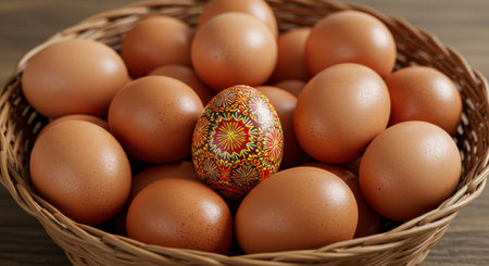 Brown eggs in a wicker basket, one is decorated with a pattern, Easter holiday background, traditional decoration, and food concept.