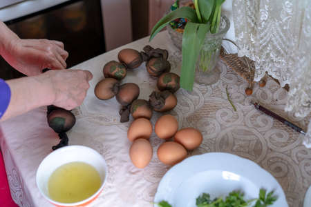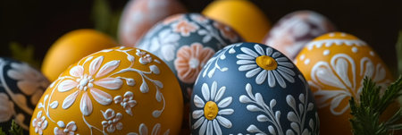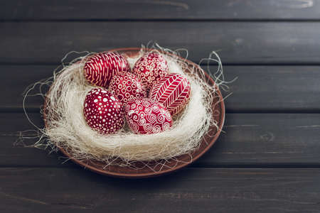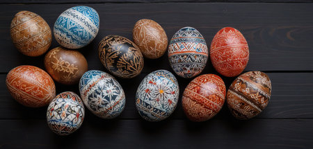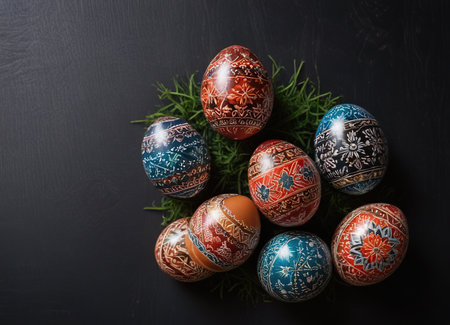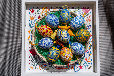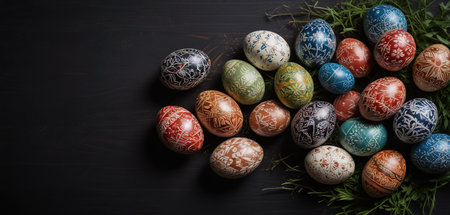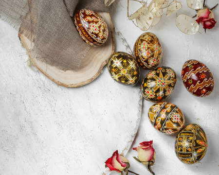 Ukrainian Easter eggs decorated with wax-resist dyeing technique, traditional for Eastern European countries, wide format, top view, copy space