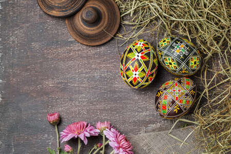 Pysanky, Ukrainian Easter eggs decorated with wax-resist dyeing technique, hay and flowers on wooden background