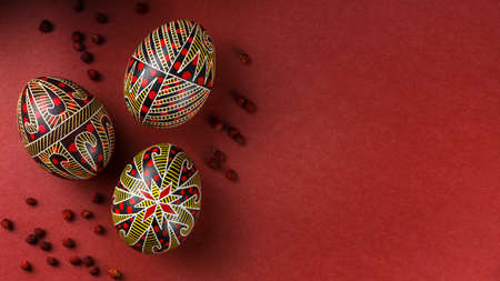 Ukrainian Pysanka on red background. Pysanky Easter eggs decorated with wax-resist dyeing technique