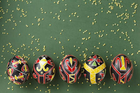 Pysanky on green background. Ukrainian Easter eggs decorated with wax-resist dyeing technique