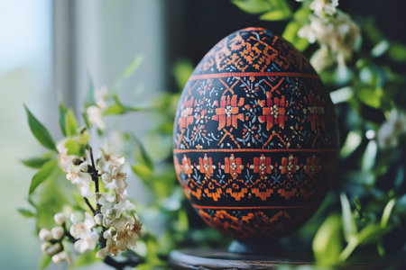 An exquisite hand-painted Easter egg among blooming spring flowers