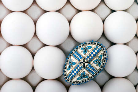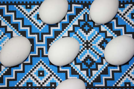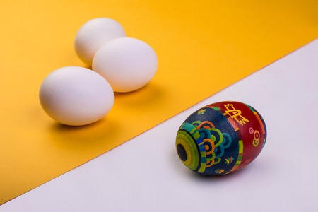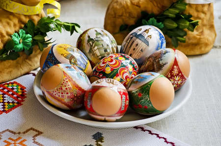 Traditional handmade Easter eggs in straw on white cloth and few organic fresh eggs in background. Traditional pattern from Bucovina