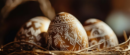 Three intricately designed eggs sit nestled in a bed of straw showcasing detailed patterns and craftsmanship perfect for spring festivities.