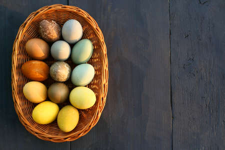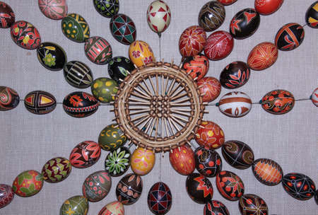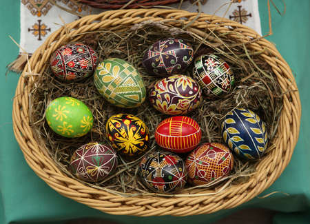 Big woven dish with Pysanky. Ukrainian Easter eggs decorated with wax-resist dyeing technique, traditional for Eastern European countries