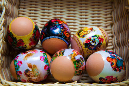 Decoupage decorated and arranged Easter eggs for a happy holiday