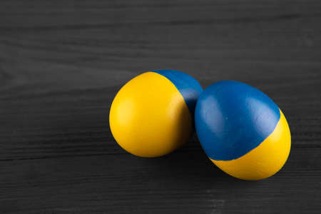 Chicken egg with the flag of Ukraine on a wooden background. Ukraine during the war, protest action, no war, peace in Ukraine 2022