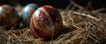 AI Generated. Pysanky, decorated Easter eggs in the nest