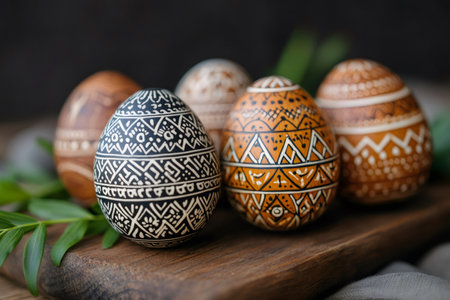 Hand-painted Easter eggs with traditional folk geometric patterns are displayed on a rustic wooden board