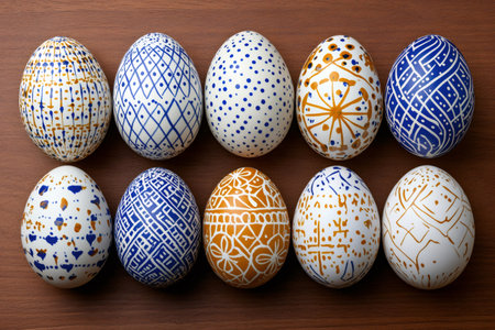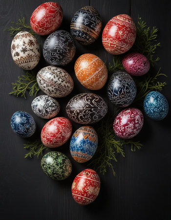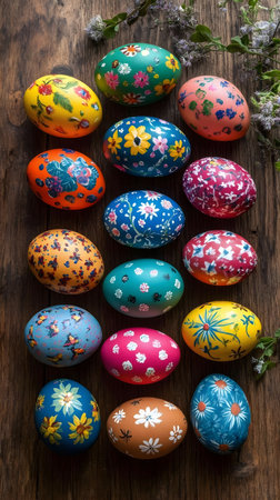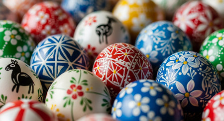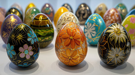A vibrant showcase of hand-painted Easter eggs featuring intricate designs and bright colors. Perfect for celebrating spring and artistic craftsmanship.