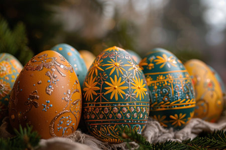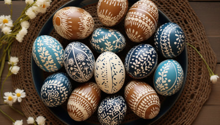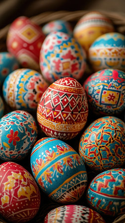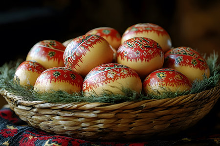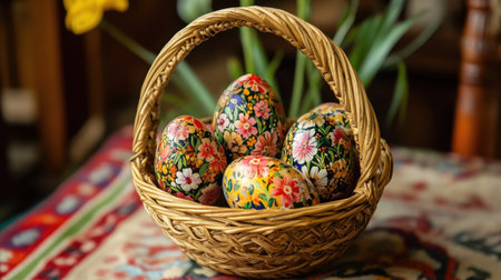 Vibrant easter eggs showcasing intricate patterns are nestled in a woven basket. adorned with traditional motifs, the eggs rest on a bed of greenery, offering a rich, cultural aesthetic perfect for holiday decoration. Generative AI