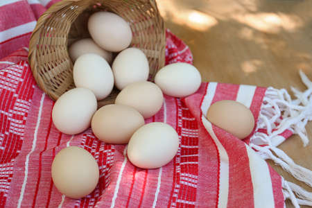 Fresh Chicken eggs in Bamboo basket on a dark gray background.