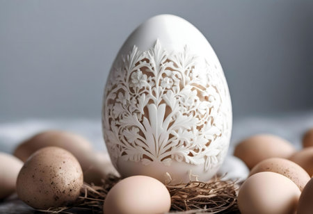A stunning white carved egg with floral patterns sits in a nest of brown eggs. The intricate detail is exquisite.