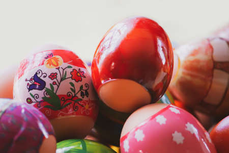 Pile of colorful manually crafted, painted decorative Easter eggs in a basket. Closeup, shallow depth of field, selective focus.
