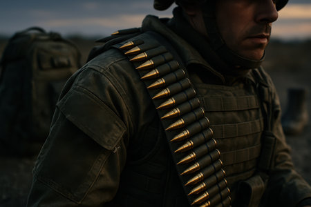 Soldier in military uniform wearing a bandolier filled with brass ammunition. the man is prepared for combat or a mission, showcasing military gear and a determined expression.