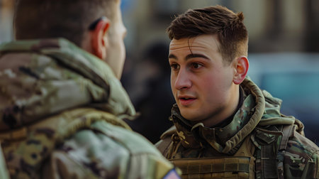 Two military personnel engaged in a serious discussion, capturing a candidate and human side of service life. A.I.