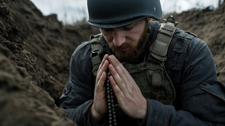 A man in a military uniform is kneeling down and praying. He is wearing a helmet and a backpack