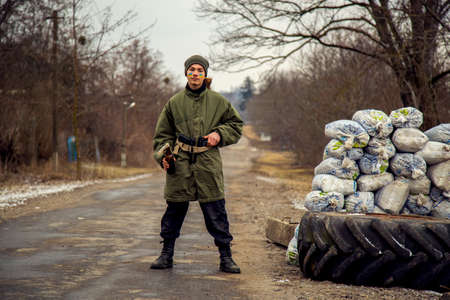 Ukrainian teenage boy with a weapon at a checkpoint. A Ukrainian patriot guards the entrance to the village.