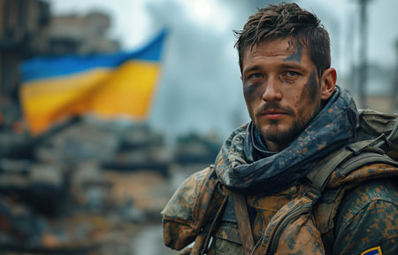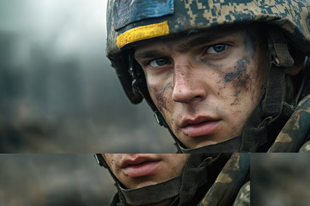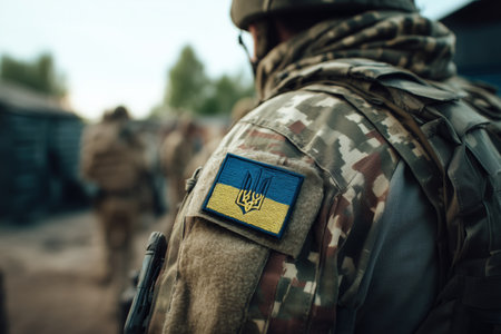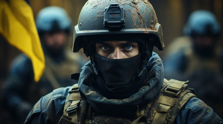 This close-up captures a Ukrainian soldier with national flag on military uniform, portraying determination and unity in the face of adversity and defending their nation.