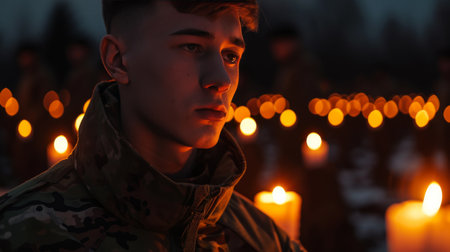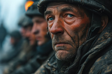 A soldier stares intensely into the distance with a determined expression, surrounded by a wartime environment while the sunlight illuminates his face, highlighting his features.