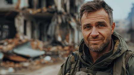 Smiling soldier in camouflage, war-torn backdrop, warm light.