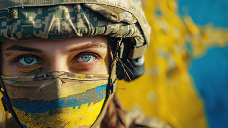 Close up portrait of Ukrainian fully armed female soldier with blue and yellow flag on background