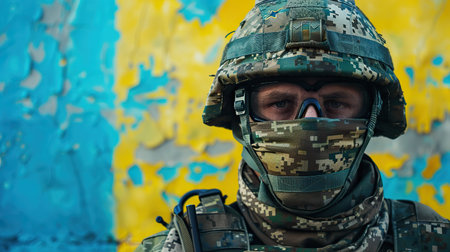 Close up portrait of Ukrainian fully armed soldier with blue and yellow color on background