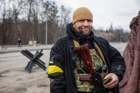 KYIV, UKRAINE - Mar. 04, 2022: War of Russia against Ukraine. Member of Kyiv territorial defense on one of Kyiv's checkpoint