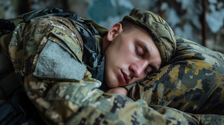A young, tired soldier takes a moment of rest, sleeping in full camouflage gear against a backdrop of a military encampment.