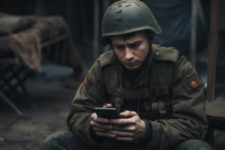 Soldier in a military uniform with a mobile phone in his hands