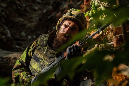 Young soldier with sad bearded face in military helmet and camouflage with gun on ruined bricks background in forest