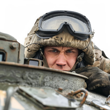 A skilled tank commander in a helmet and goggles, giving orders from a tank hatch, isolated on white background