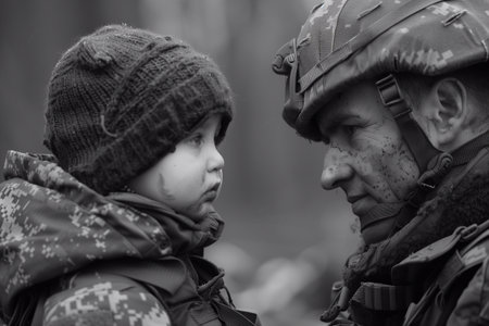Soldier shares a moment of connection with a child in a forest during difficult times