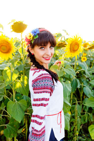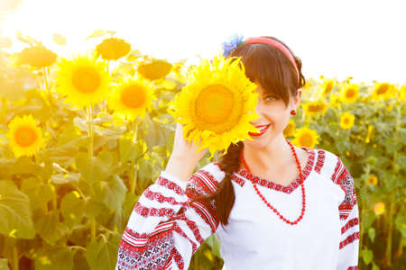 Beautiful smiling woman in national ukrainian blouse embrodery looking to camera on a sunflower field on sunset, backlight