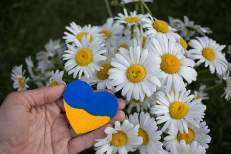 bouquet of white daisies and a yellow-blue heart in the palm of hand. A patriotic gift, gratitude to the world from Ukraine. concept of faith, positivity, love and peace. Stop the war in Ukraine