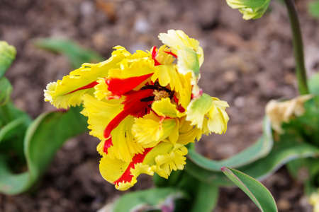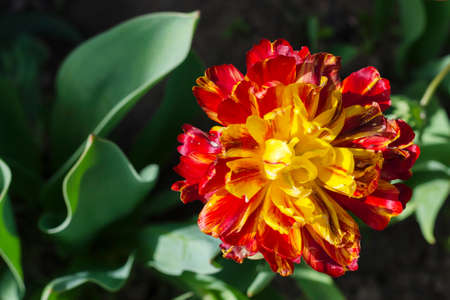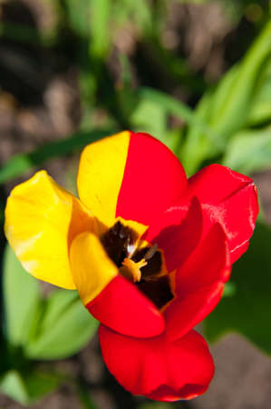 Beautiful yellow and red tulip closeup on green foliage background. Top view