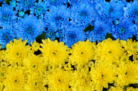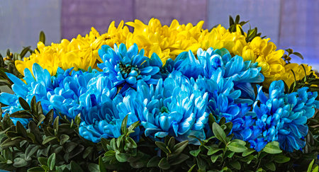 A bouquet of chrysanthemum flowers in the colors of the Ukrainian flag. Blue and yellow stripes. close up view.