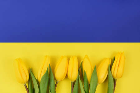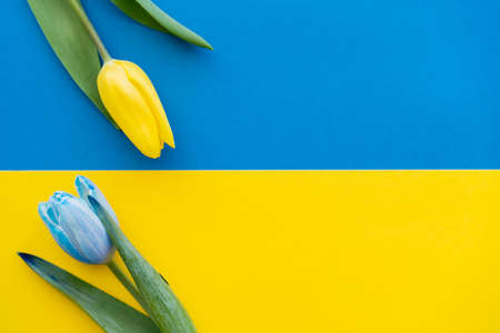 Top view of yellow and blue tulips with leaves on ukrainian flag
