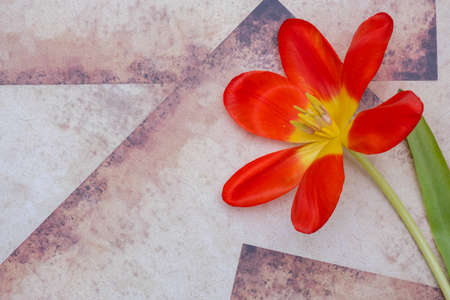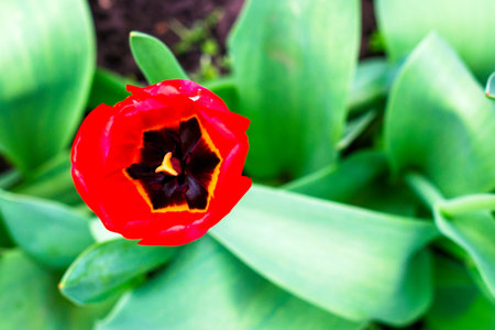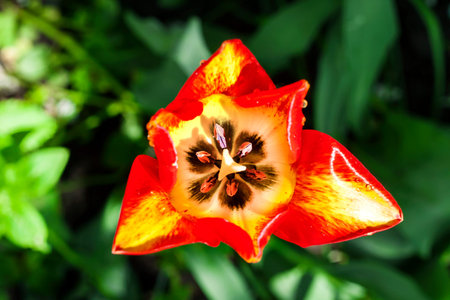 Vivid opened red tulip in macro. Picturesque background of beautiful red and yellow flower. View from above. Pestle and stamen close up.