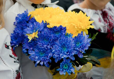 Flowers colors of the flag of Ukraine in the hands of a child. National traditions.