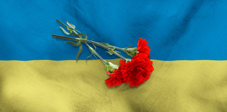 Three red carnations lay on a blue and yellow Ukrainian flag, symbolizing remembrance and hope.