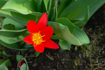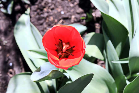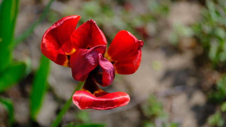 red opened tulip in the daytime in the park. bright sunny day, greening in the city