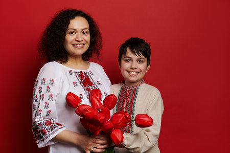 Happy ethnic woman and teen boy, mother and son in traditional Ukrainian embroidered shirts, posing with a bunch of red tulips, smiling looking at camera isolated on red background. Ukraine - culture