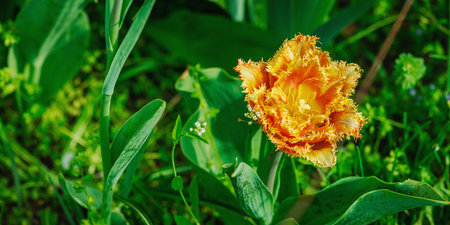 Blooming tulips grow in the garden. Spring gardening, outdoor concept background, floral style. Beautiful nature wallpaper, banner format